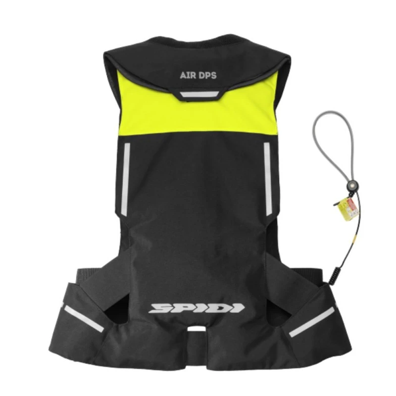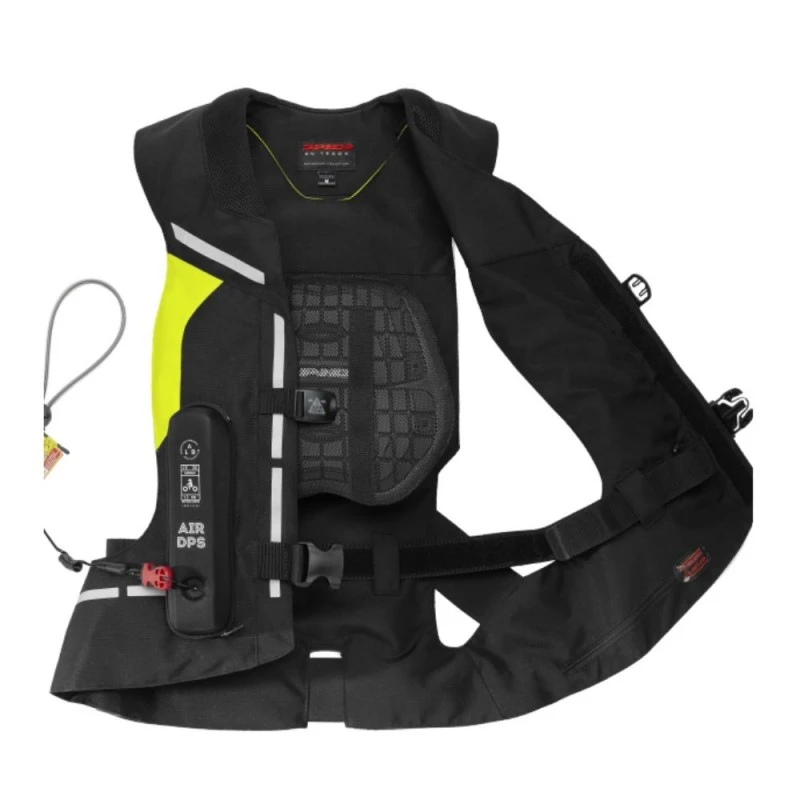 Chaleco SPIDI Air DPS amarillo fluor. Es un sistema de protección que envuelve al piloto tanto por el torso como en el cuelo, aumentando así el nivel de seguridad en las zonas más sensibles del cuerpo. Este sistema está diseñado para reducir los movimientos del cuello más bruscos, evitando así lesiones graves y aumentando altamente la tendencia del cuerpo a rodar, reduciendo de esta manera posibles torsiones más dañinas.
