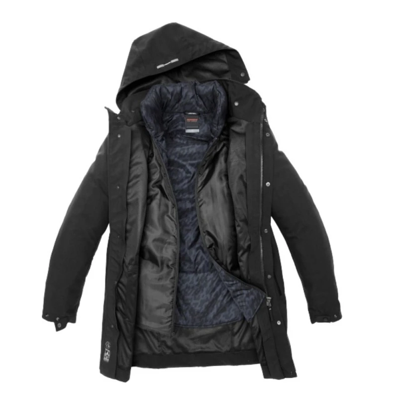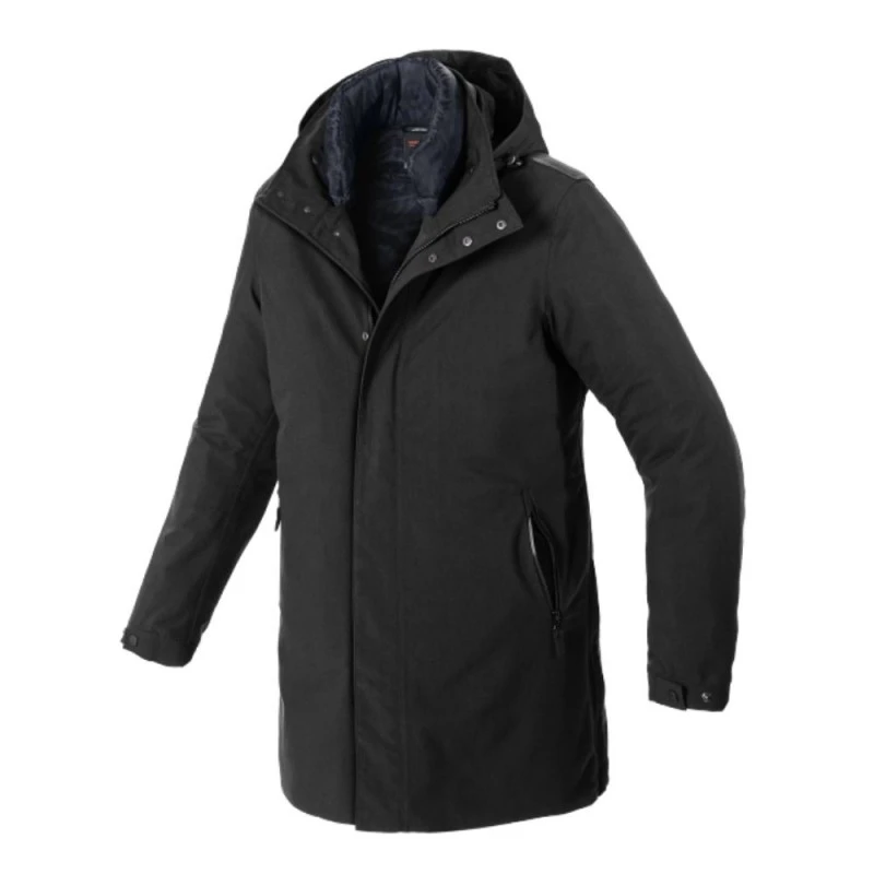 Chaqueta SPIDI Beta Pro negro. Abrigo de motociclista urbano. El tejido exterior laminado de 3 capas presenta la membrana Dermizax® by Toray®: esta particular membrana de control molecular se acopla directamente al tejido exterior, asegurando una impermeabilidad al 100%, una transpirabilidad extremadamente rápida y niveles mínimos de condensación. El tejido exterior en Cebonner® permite un ajuste excepcional, gracias a la elasticidad en los dos ejes y los más altos niveles de resistencia a la abrasión. La chaqueta térmica interior desmontable de 150gr/m² hace que la Beta Pro sea perfecta para los días más fríos. La chaqueta cuenta con la certificación CE prEN 17092-2:2017 Clase AA gracias a los protectores Warrior Light estándar en hombros y codos. Los protectores de espalda Warrior de nivel 1 y nivel 2 están disponibles como opciones.