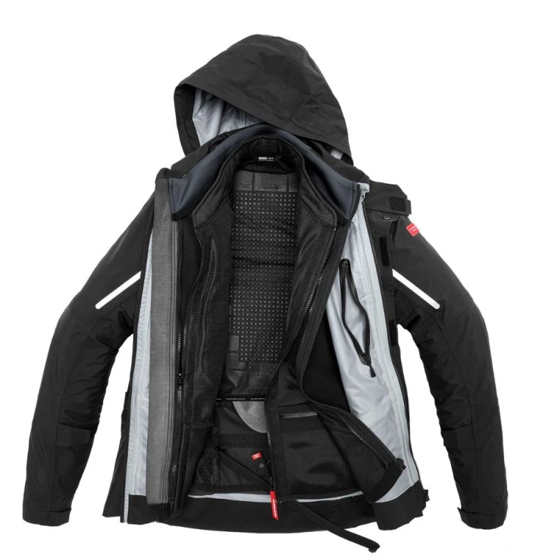 Chaqueta SPIDI H2out Adventure Mission-T negro. Creada para los pilotos de aventura más exigentes, la SPIDI Adventure Mission-T introduce por primera vez en el mercado la tecnología STEP-INARMOR, propiedad de SPIDI es la combinación de tres capas, protección (Armor), térmico (Soft Shell) e impermeable exterior (Hard Shell).