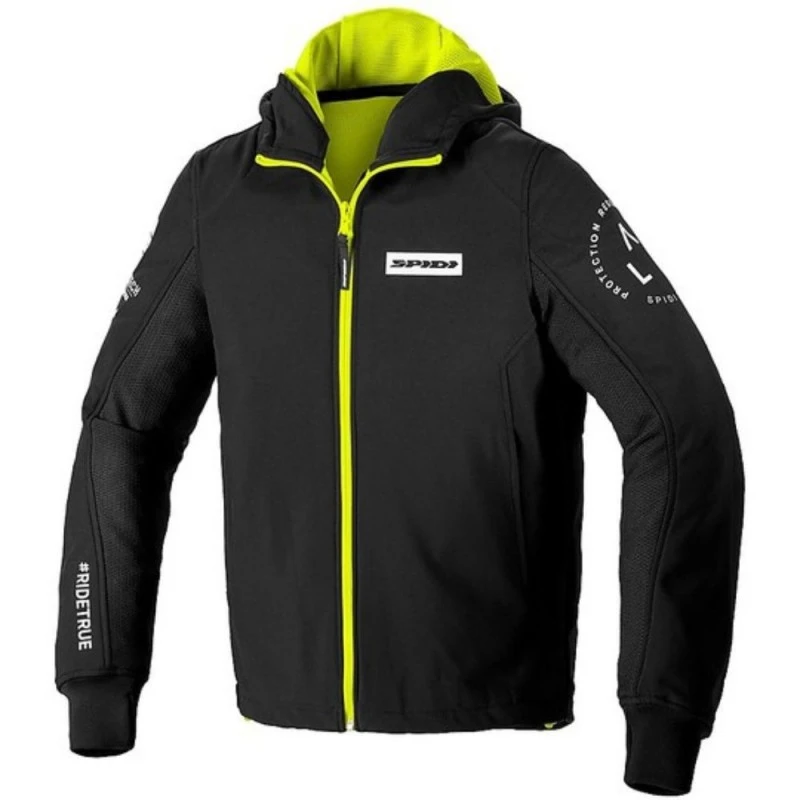 Chaqueta SPIDI Hoodie Armor Evo negro / amarillo fluor. La chaqueta, certificada prEN 17092-4: 2017 Clase A, tiene una capucha integrada, un enorme bolsillo impermeable, protectores extraíbles Warrior Lite certificados de nivel 1 en hombros y codos, con protector de espalda Back Warrior opcional (nivel 1 En 1621-2: 2012). La carcasa del Hoodie Armor está fabricada con un tejido de tres capas, con membrana Windout laminada al forro polar interno: esto garantiza la protección contra el viento y un enorme confort en cualquier situación de conducción.