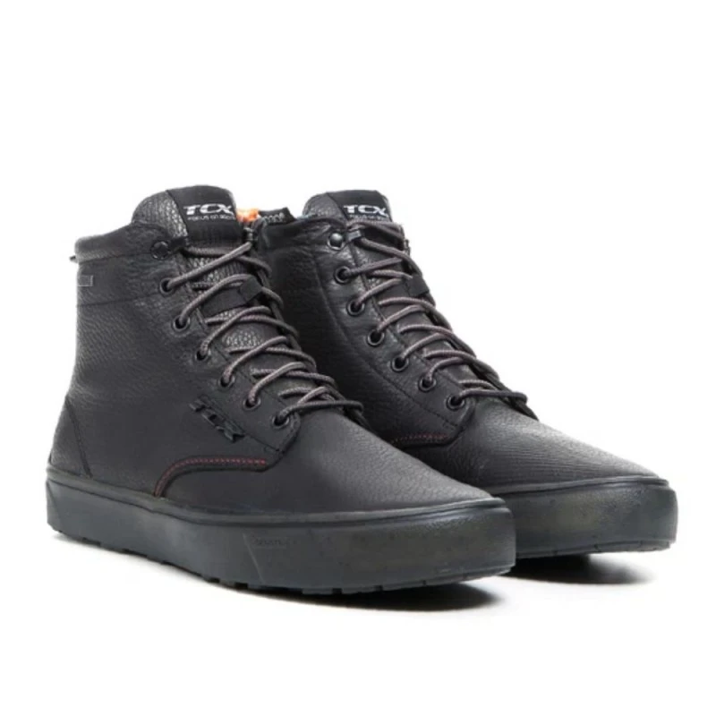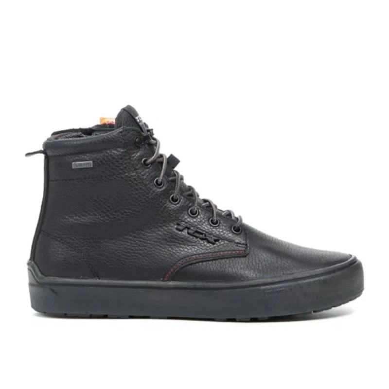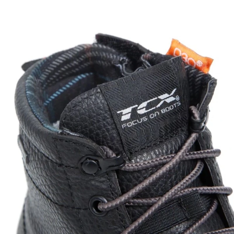 Zapatillas TCX Dartwood GTX negro. Fabricadas en piel de plena flor con membrana Gore-Tex que garantiza la máxima transpirablilidad. El cierre se efectúa mediante cremallera lateral y cordones con banda flexible donde puedes guardar los nudos y así evitar que se enganchen en los estribos de la moto. Las TCX Dartwood disponen de protecciones de última generación D3O en el maléolo además de otros protectores en la puntera y en el talón. La suela Groundtrax está desarrollada para garantizar estabilidad, adherencia y tracción tanto arriba de la moto como una vez bajo.