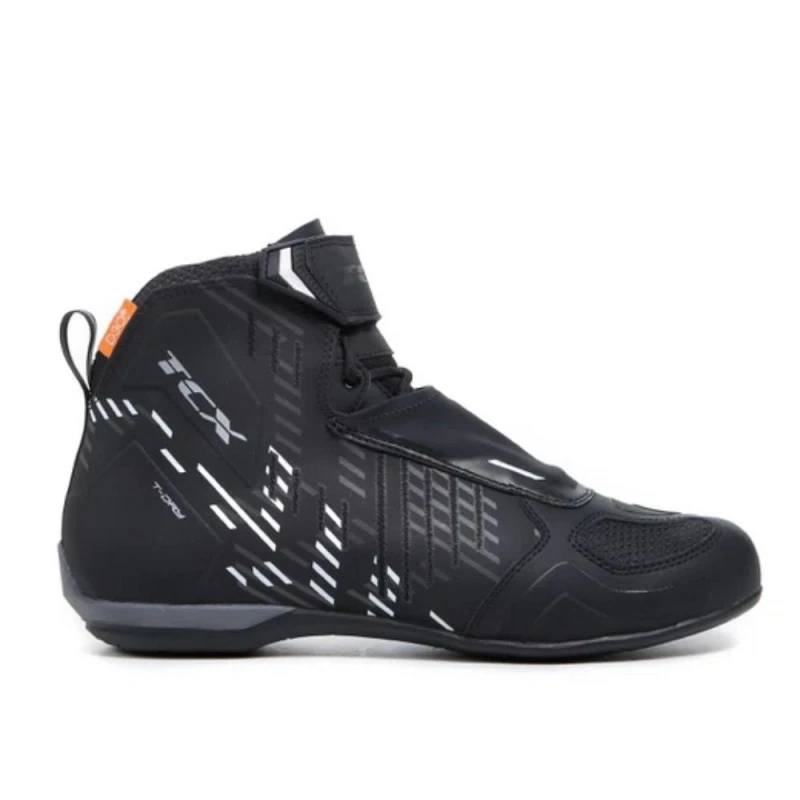 Zapatillas TCX R04D WP negro / blanco. Las zapatillas TCX R04D Waterproof han sido pensadas para satisfacer las necesidades de los usuarios en recorridos cortos tanto urbanos como fuera de urbe con una clara orientación deportiva. Disponen de malla transpirable en la parte superior y membrana impermeable T Dry aparte de inserciones D3O en el tobillo y refuerzos en la puntera y el talón.