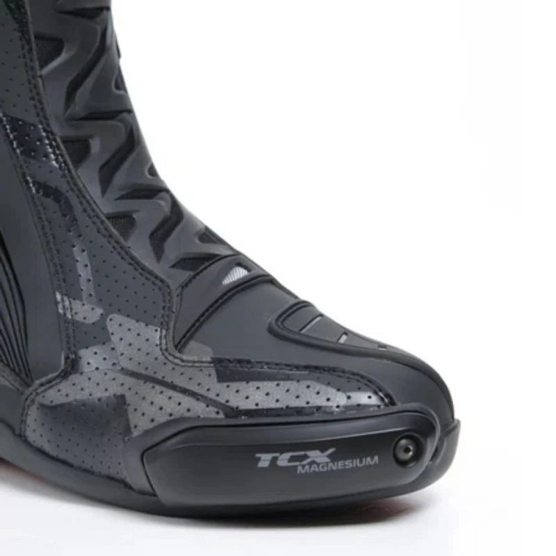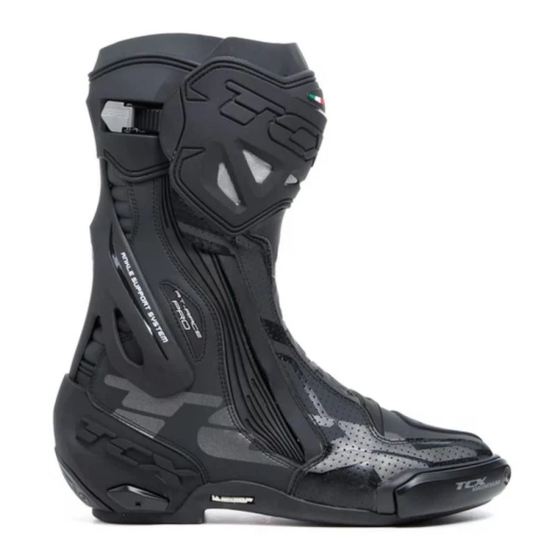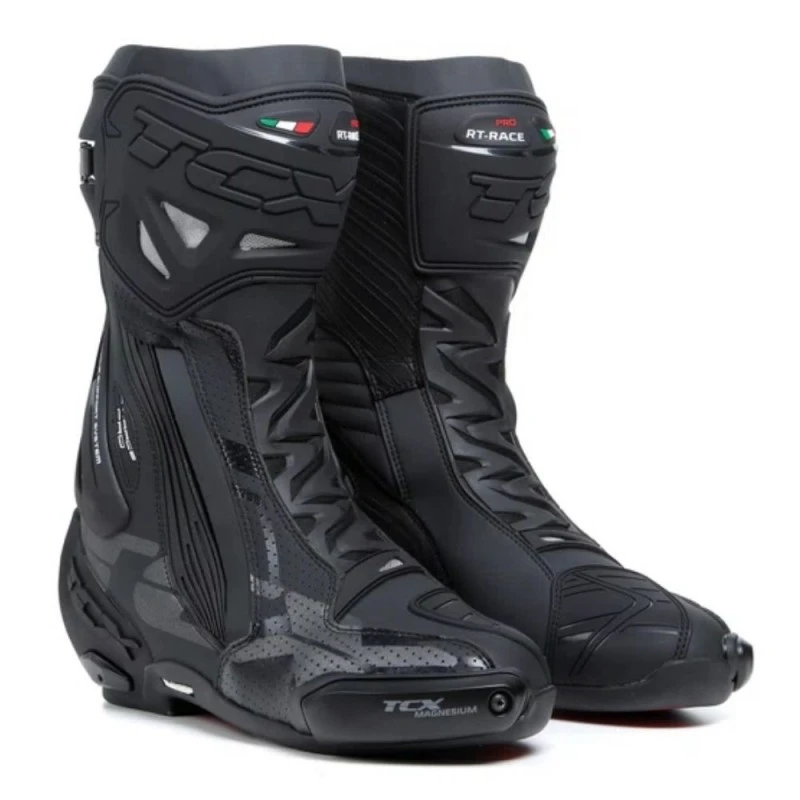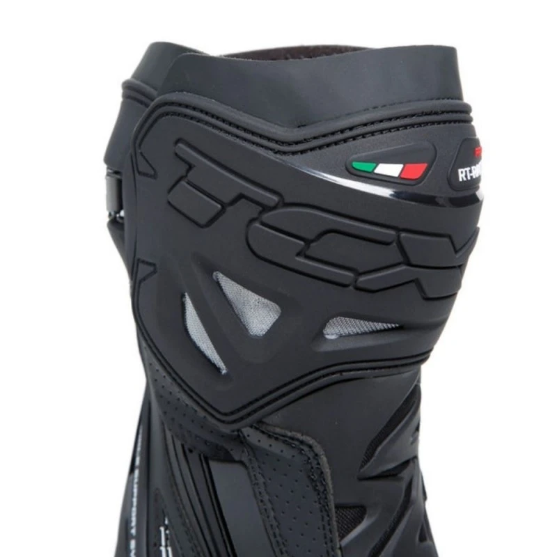 Botas TCX RT-Race PRO Air negro / reflex. Las RT-Race Pro Air representan la máxima tecnología y experiencia adquirida por TCX en la competición para ofrecer al conduzco lo mejor de lo mejor en protección, ajuste y sensibilidad sobre la moto. Realizadas en Microfibra de alta tecnología, las botas TCX RT-Race Pro Air incorporan el sistema D.F.C que reduce el peligro de hiperextensión de la articulación y de esguince en el tobillo.