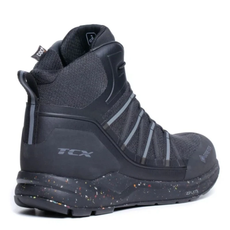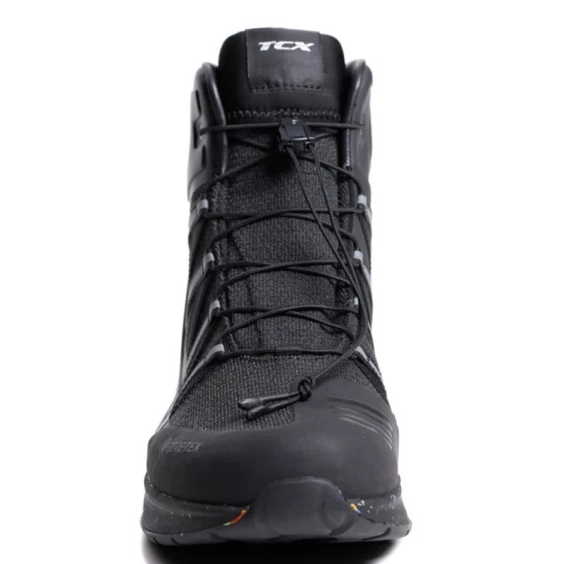 Botines TCX Speedtrek Gore-Tex® negro / negro. Los botines de moto certificado con tecnología Gore-Tex Extended EpE®, suela alta Groundtrax® para dar estabilidad e inserto Zplate®. Una combinación ideal de protección y confort, es el zapato para los desplazamientos diarios, tanto en moto como a pie, en todas las condiciones climáticas.