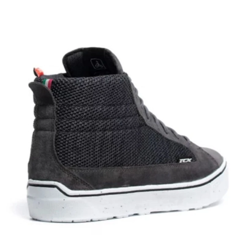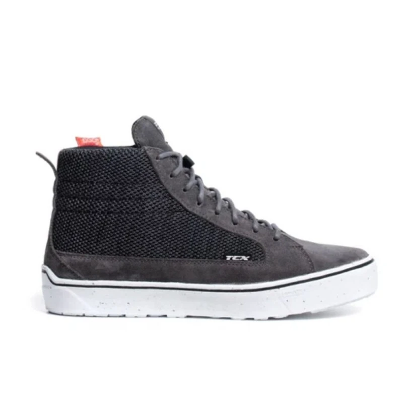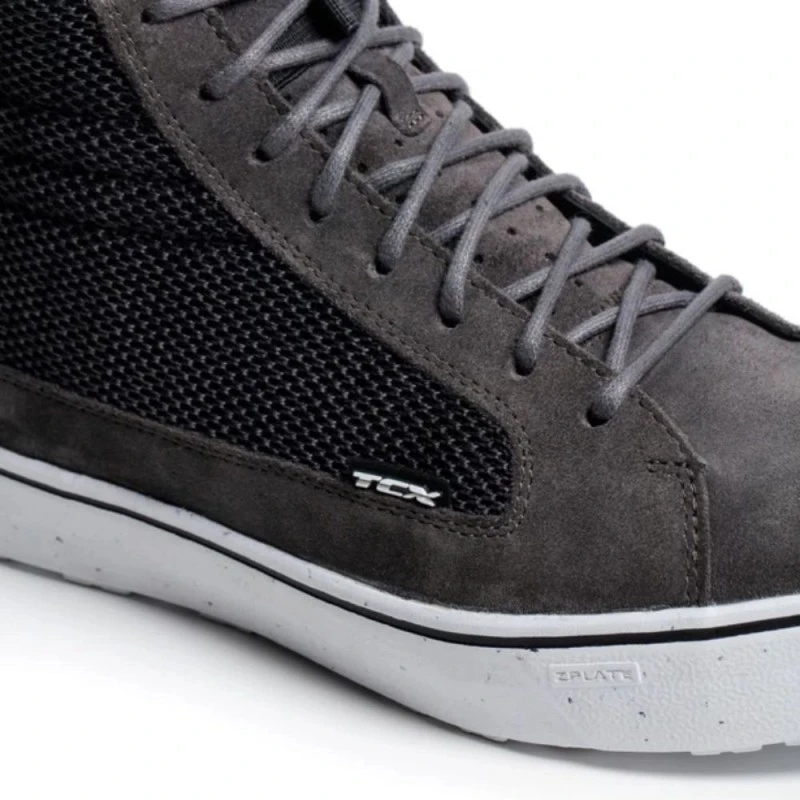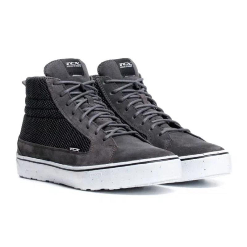 Zapatillas TCX Street 3 Air gris / blanco. Fabricadas en piel gamuzada y tejido mesh transpirable con forro impermeable T-Dry que sostiene los pies secos en todo instante. El cierre se efectúa a través de cordones mas tiene una banda flexible donde puedes guardar los lazos y así evitar que se enganchen en los estribos de la motocicleta. Las TCX Street tres Air disponen de protecciones de nueva generación D3O en el maléolo aparte de otros protectores en la puntera y en el talón. La suela Groundtrax está diseñada para asegurar estabilidad, adherencia y tracción tanto arriba de la motocicleta como una vez bajo. La entresuela tiene la inserción Zplate para mantener una adecuada flexibilidad del zapato y además garantiza una correcta rigidez transversal para proteger el pie en caso de caída. En definitiva, unas zapatillas que te permitirán conducir de manera segura y estilo, las 24 horas del día, los siete días de la semana.